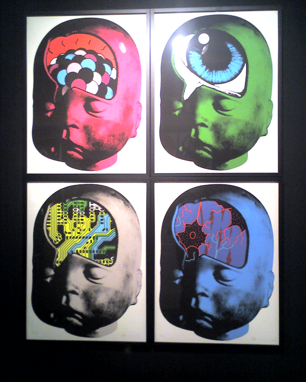 Remember a couple weeks ago I saw a sticker somewhere of the Gumball Baby Head in the top left quadrant of the above photograph? Turns out, it’s the work of an artist named Paul Insect, and he’s got a show up at Fifty24SF right now (pictured), and it’s pretty good. Lots more baby heads filled with interesting things. Plus some non-baby-head stuff for those of you not as enamored of these as me.