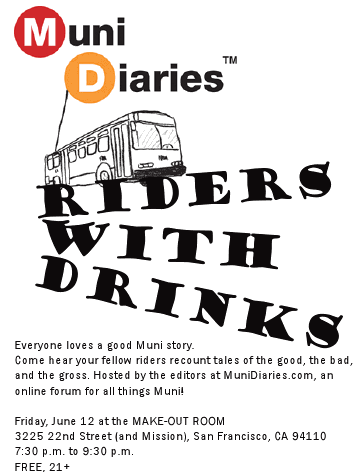 Muni Diaries will be hosting “Riders with Drinks” this Friday at 7:30pm at the Make-Out Room on 22nd. I personally cannot wait to hear more surreal stories of “the Muni Humper” while getting sloppy off $2 PBR.