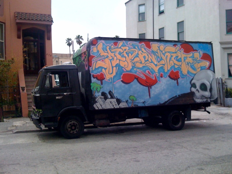 That truck belongs to a meatmarket at 18th and mission near thrift town. A friend did the alien on the back which is original and over a year old. The sides and front may have been redone since then.