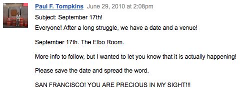 So that’s it: Paul F. Tompkins, September 17th at the Elbo Room, thanks to hundreds of folks joining a Facebook group.