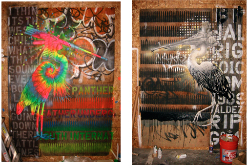 The work for this installation involves large scale mixed media pieces on wooden panels, each commenting on contemporary sociopolitical issues in a cause and effect statement. Hazelip’s installation will be up from July 10 – November 13, 2010 and can be seen from the street 24 hours a day and seven days a week. The SFMOMA Garage Windows are located at street level 147 Minna and 150 Natoma St. (between Third and New Montgomery Sts.). The artist will host an opening reception at The Earth Bar at Temple Nightclub, located at 540 Howard Street on Saturday, July 10, 2010 from 2-7PM.