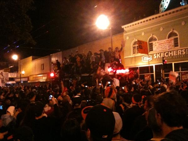 As Burrito Justice described previously, here is the crowd dancing atop a hijacked firetruck.