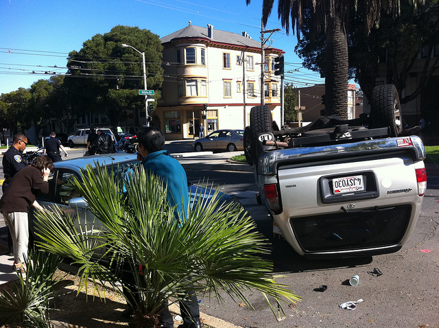 The SUV was actually hit by a Honda Accord (http://flic.kr/p/8Qmgsz), went on 2 wheels, hit the parked car, then flipped. Mind you, I got all this by reading one of the police officer’s hand motions, so I could be totally wrong.