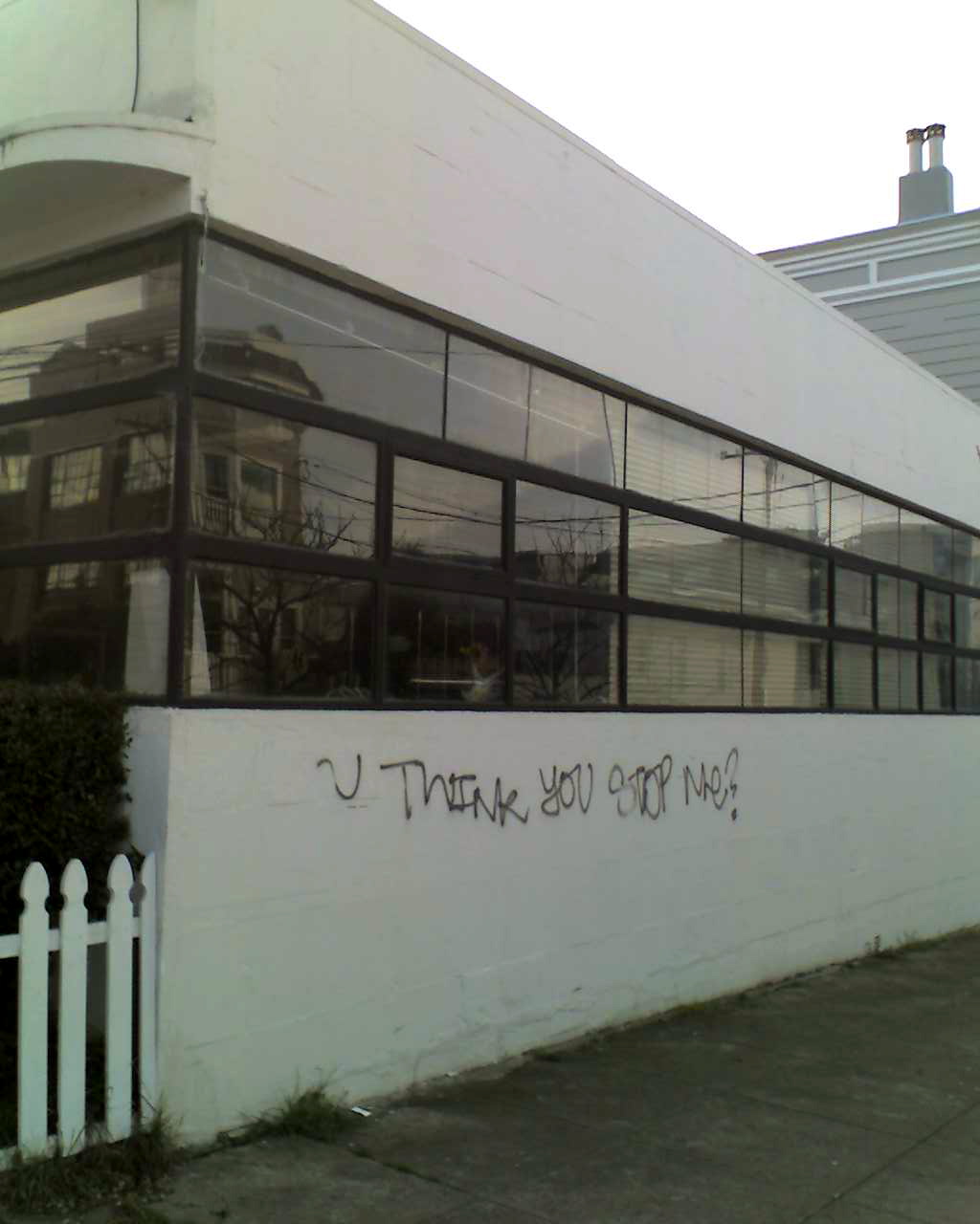 Belated comment on this one – I happen to own and live in that building and frankly I quite liked the initial tag line in all its nonsensical glory…unfortunately it inspired others to add their wholly unreadable, sloppy ugly tags…eventually had to paint over all of them as I didn’t want to pay the city fine – this is NOT an invitation to everyone to come tag my house, PLEASE!! Yes, the building does look similar to Farina (both mid-century modernist) and thank you Brock Keeling for admiring our windows – they’re the original 1946 frames and glass….