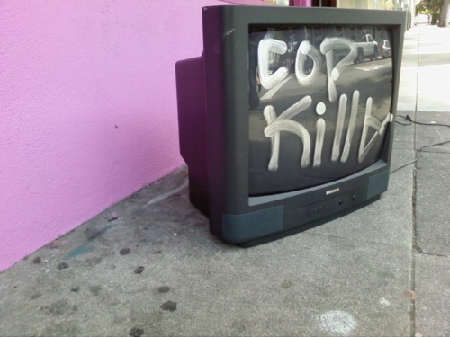 A poignant message captured by our friends at the Tenderloin Geographic Society leaves so much to interpretation. Like, does all the violence on TV lead to a desensitization of society that makes cop killing seem normal, or almost celebrated? What’s the significance of the upside-down “A”? Is this merely just a huge Ice-T fan?