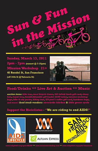 There will be a silent auction including: Leader frame and fork, Masi bicycle frame, bike tours by Stoked SF, $40 Falletti foods gift card, Chuey hats, Bumble & Bumble gift basket ($100 value), Mission Workshop messenger bag, Hambone bag, poster by Bikes and the City, coffee by Bicycle Coffee Co.