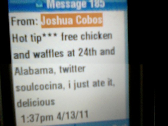 One Response to “Free chicken and waffles RIGHT NOW”