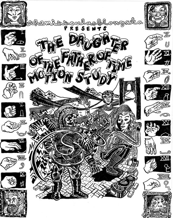 This April, The Missoula Oblongata will be touring their new play, The Daughter of the Father of Time Motion Study around the country. It’s the company’s sixth touring production–this one half the size of their usual main-stage fare, but with all of the moving parts, twisty dialog, and duct-taped together lighting that the company has become known for. And all of it is created, performed, and operated from the stage (that is, a 6′ x 6′ x ’6 box) by the three full-time members of the company: Madeline ffitch, Sarah Lowry, and Donna Sellinger.