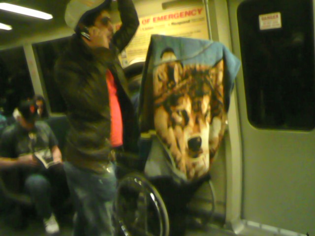 I saw this man travelling up Bryant, the really horrifying thing is he tends to wheel backwards and the wolf blanket is perfectly aligned with his shoulders, so it looks like this man beast is barrelling towards you. Pretty awesome tactic really.