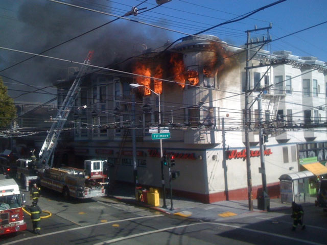 Here in the Mission we saw the scene from afar, but it looked a bit gnarlier up close, as you can see — and it displaced a bunch of nice people. Thankfully, a bunch of other nice people have set up a benefit tonight at Peacock Lounge: