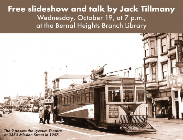 Surely you’ve wondered what went on at all those run-down theaters lining Mission street before they were converted to dollar stores, parking structures, and termite farms. Well now is your chance to find out. Jack Tillmany, a San Francisco transit and theater historian, will be hosting a free presentation tomorrow, Wednesday 10/19 7pm at the Bernal Heights Public Library.