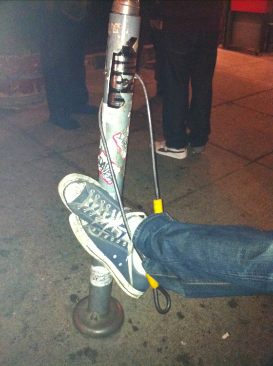 New trends in sitting: using your bike lock cable as a makeshift footrest.