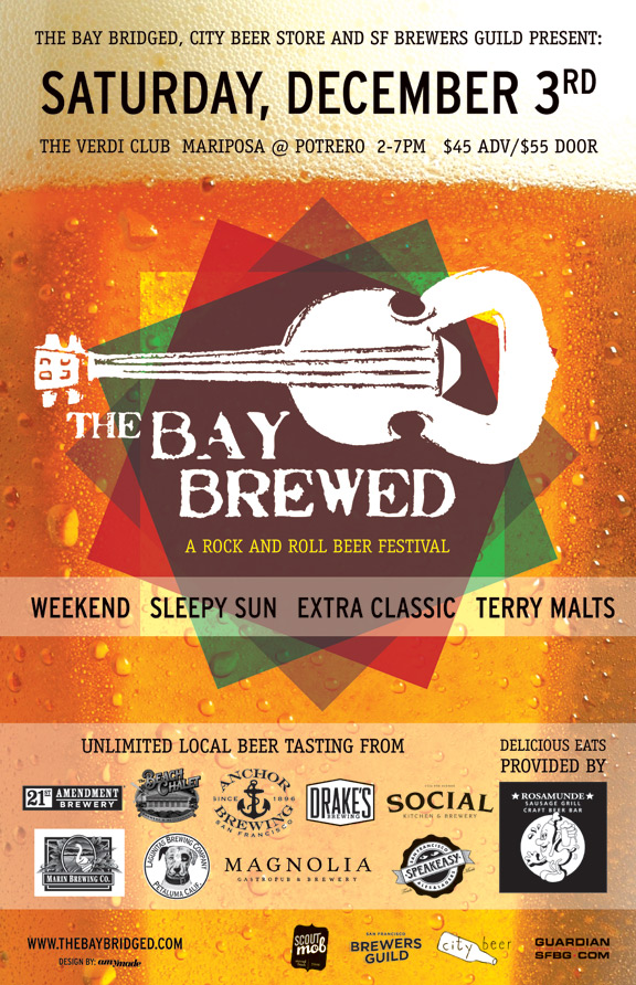 This is our second NEW event of 2011 and I am really excited that this one is finally going to happen for real. The idea is this: you go to a beer festival and pay $60 to taste unlimited beers, which is great and all, but the music usually SUCKS. We decided why not bring down the ticket price, invite all the amazing local breweries (Lagunitas, 21st Ammendment, Anchor… list goes on), get sausages from Rosamunde, and then enlist AWESOME local bands. You and I both know that I would pay $45 to see Terry Malts any day of the week, but Weekend and Sleepy Sun are worth the ticket price alone. And you’ll leave with a Bay Brewed beer glass for keeps!