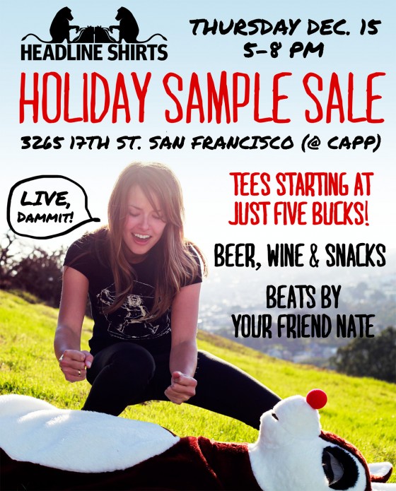 Remember that hipster-taco-riding-a-bike-in-the-Mission shirt we loved so much a few years back? That was Headline Shirts, and tonight they’re having a big sale. Roxzann from Headline fills us in: