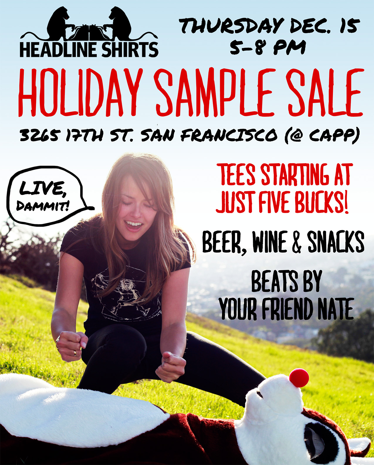 We’re having a Holiday Sample Sale, there will be cheap tees but more importantly drinks, snacks, and sweet beets spun by our sales manager (we make a great team). I will also be in a baboon suit running around and having a gas! Fun right?