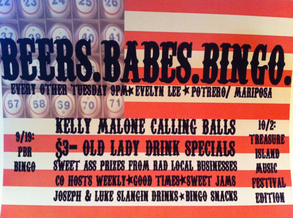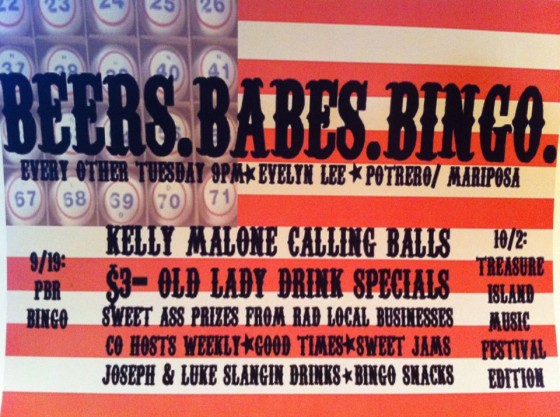 Every other tuesday, we all drink some beer, babes of both persuasions come out and we play with balls, bingo balls. I’m calling balls with some friends, put out some bingo snacks and yall win free drinks and rad prizes while we get a lil rowdy.