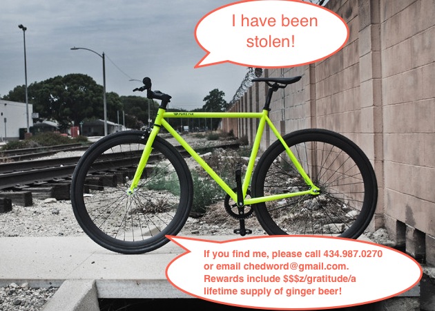 I figure it’s a longshot, but someone stole my beloved bright-yellow green glow-in-the-dark bike while I was out at dinner tonight! The bike was kind of my baby/I had it locked to my older crappier one and a railing in my apartment building.