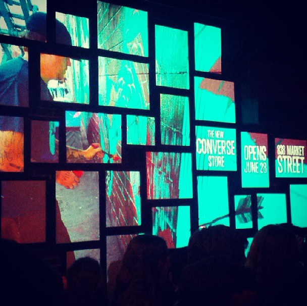 A wall of televisions displayed a big ad for the new Converse Store opening soon on Market Street, featuring this image of Andrew Schoultz finishing up his mural on the side of Pop’s: