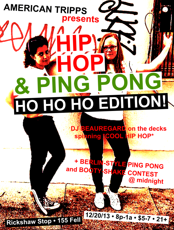 DJ Beauregard will spin *COOL HIP HOP* all night long, and of course there will be Berlin-style ping pong action — and dance floor action — on the dance floor!