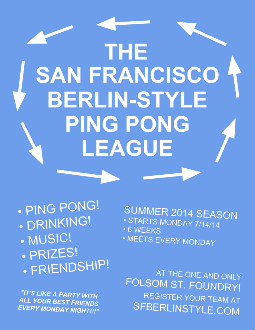New season of the SFBSPPL starts July 14th at Folsom Street Foundry and runs every Monday for 6 weeks. It’s basically a weekly party with cool people, great music, killer beer selection, excellent panini, fun prizes and LOTS of ping pong.