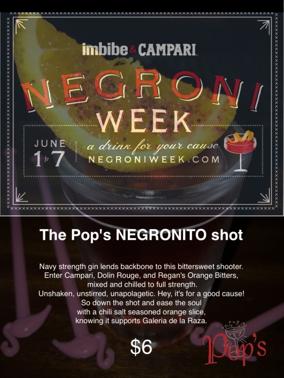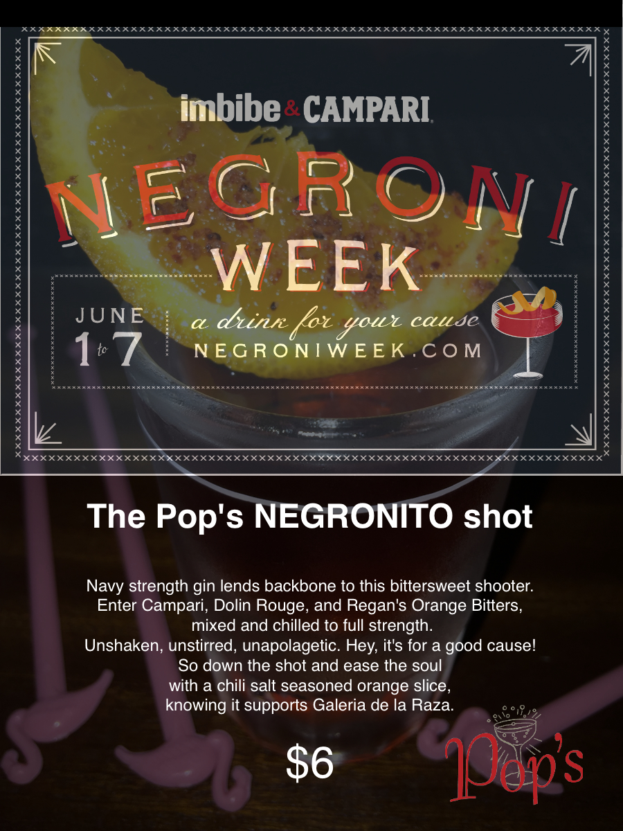 This week we ask you to take one for the team and drink for a cause! All week long as part of Negroni Week you can drink to benefit Galeria de la Raza art gallery and community space in the mission. Pop’s Bar introduces the NEGRONITO shot: Navy strength gin lends backbone to this bittersweet shooter. Enter Campari, Dolin Rouge, and Regan’s Orange Bitters, mixed and chilled to full strength. Unshaken, unstirred, unapolagetic. Hey, it’s for a good cause! So down the shot and ease the soul with a chili salt seasoned orange slice, knowing it supports Galeria de la Raza. $6 Negronito Shot available June 1st-June 7th.