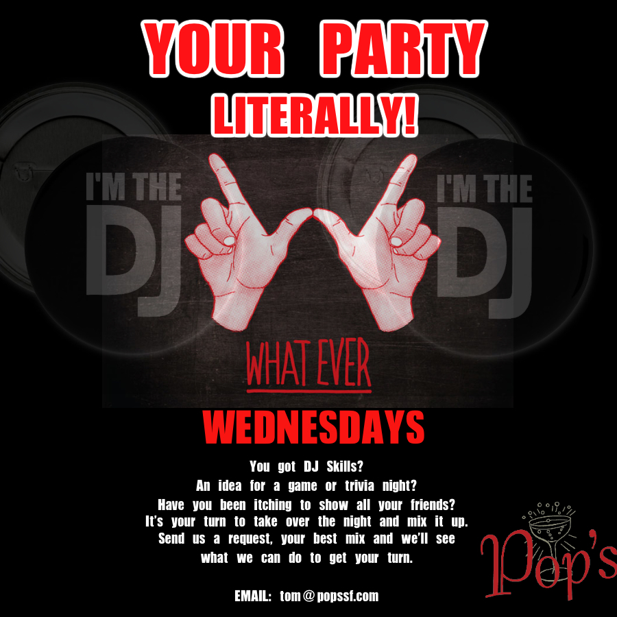 Calling all aspiring DJs! Have you heard about Whatever Wednesdays at Pops? It’s your party…LITERALLY. Have an idea for a great party or event at Pops Bar? Want to show off your skills to your friends? Send us your ideas and your best mix, and we’ll work to get you your very own DJ night in San Francisco. That’s nothing to sneeze at! Email: tom@popssf.com