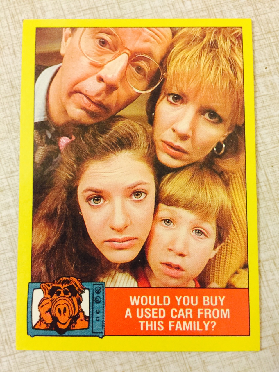 I was eating my cheeseburger last night after the game (because St. Francis is now open for dinner Friday-Sunday) when our server delivered a pack of Alf cards sent to us by a neighboring table. I really like this particular card.